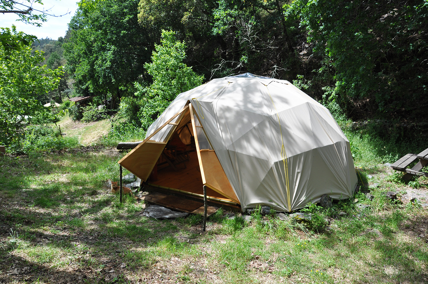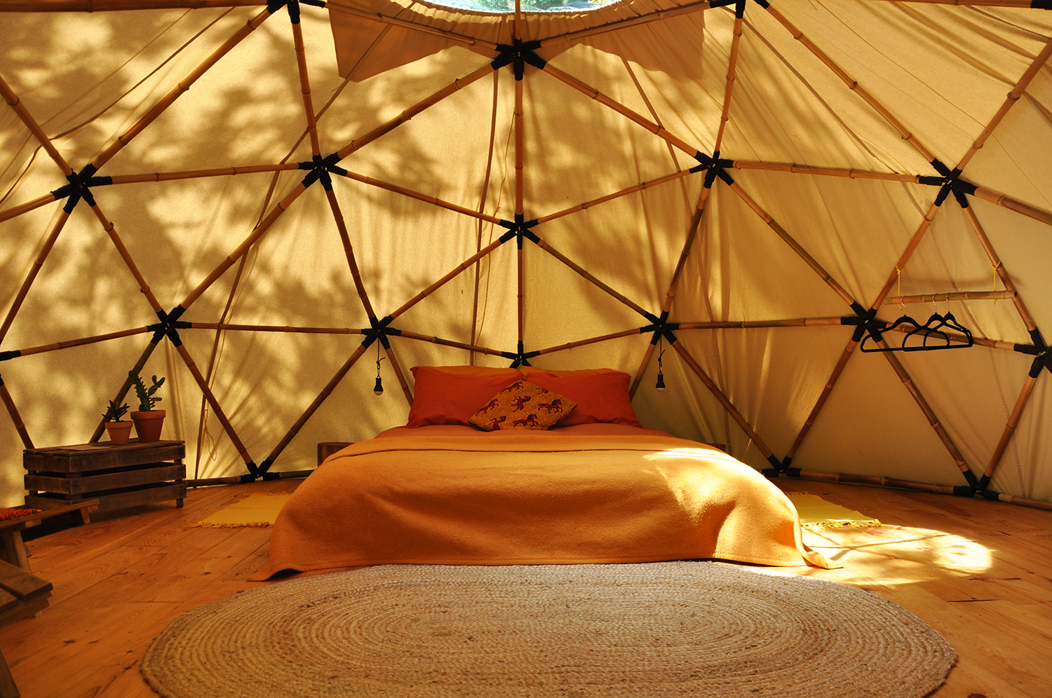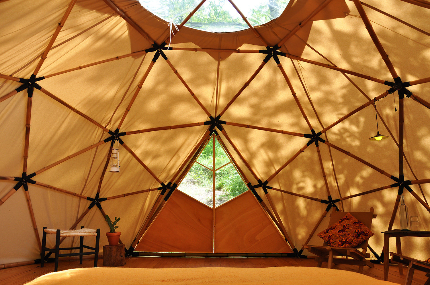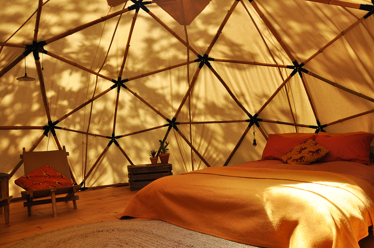 This Dome was built as part of a small glamping business. It was made completely from scratch, the main geodesic structure is made from locally sourced bamboo canes and recycled water pipes. The whole structure is completely collapsible and is stored during the winter. It features a custom triangular door & doorframe. Most additional furniture and fixings were also hand-crafted.