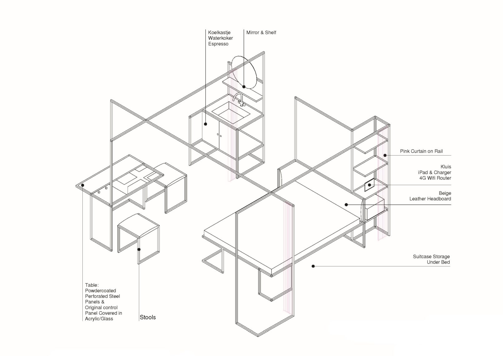 Westerdok was an interesting because due to restrictions we could not drill into the ceiling. So we had to create a self containing furniture unit that housed the bed, table and most importantly the curtains.
