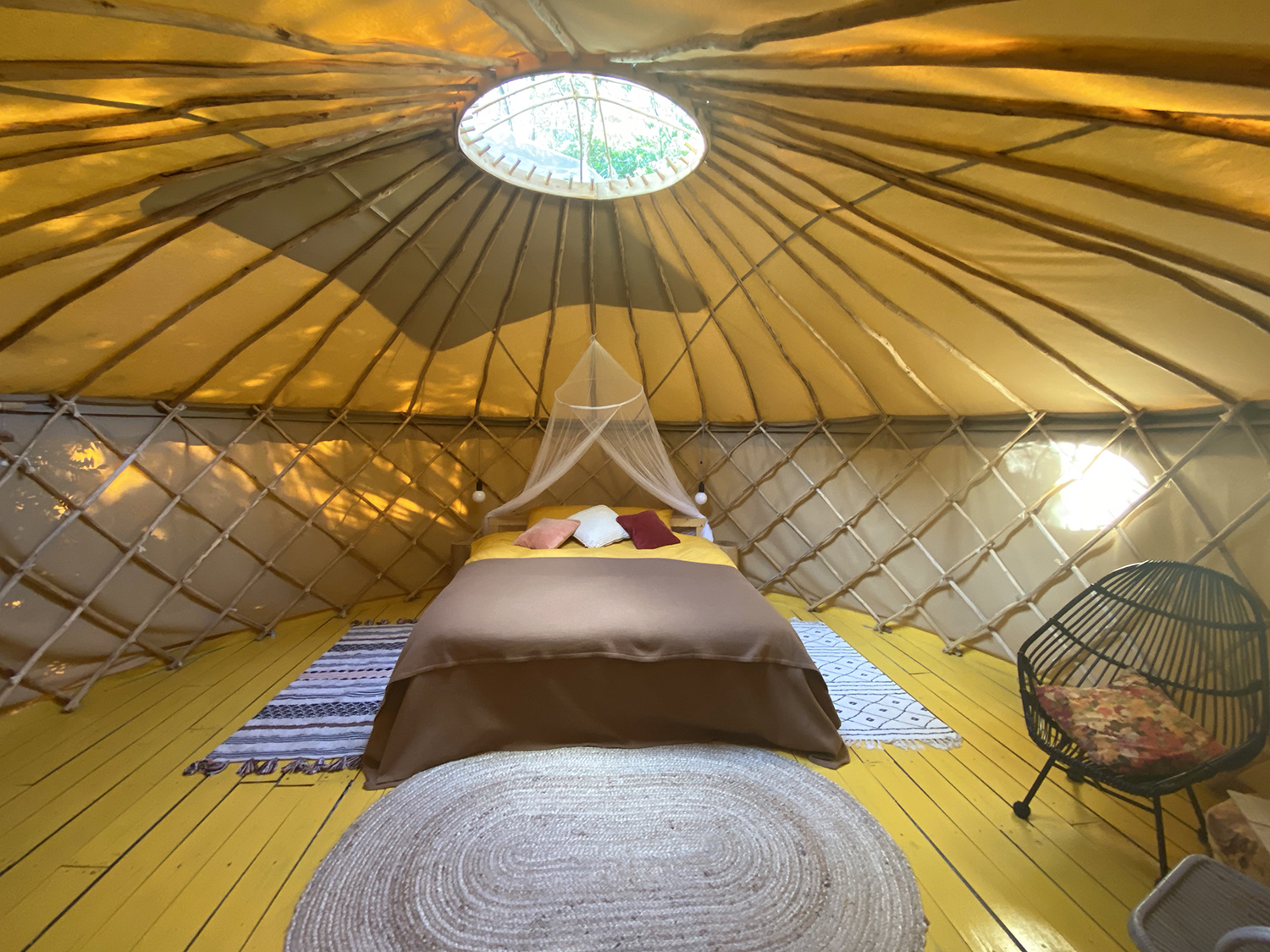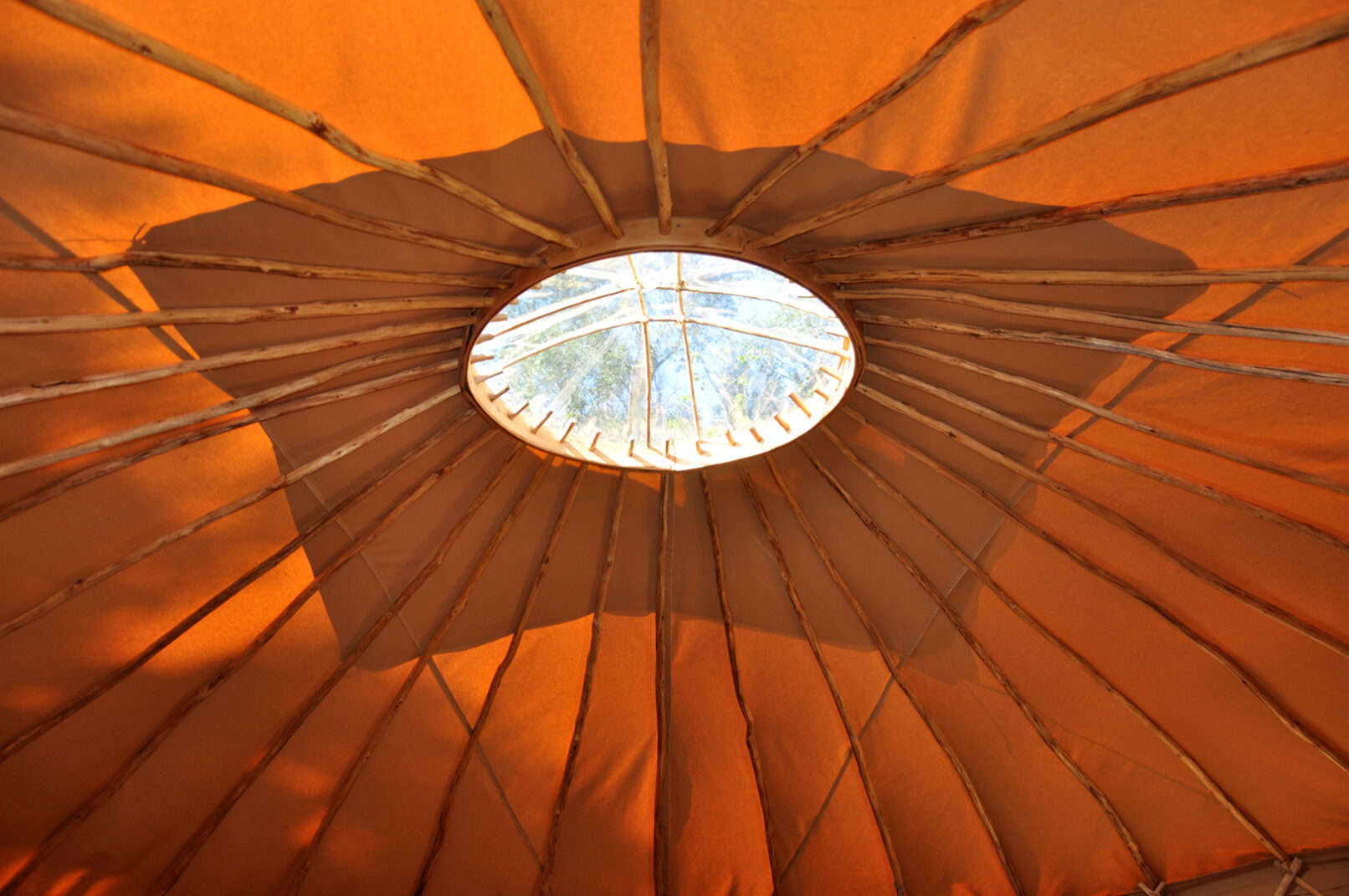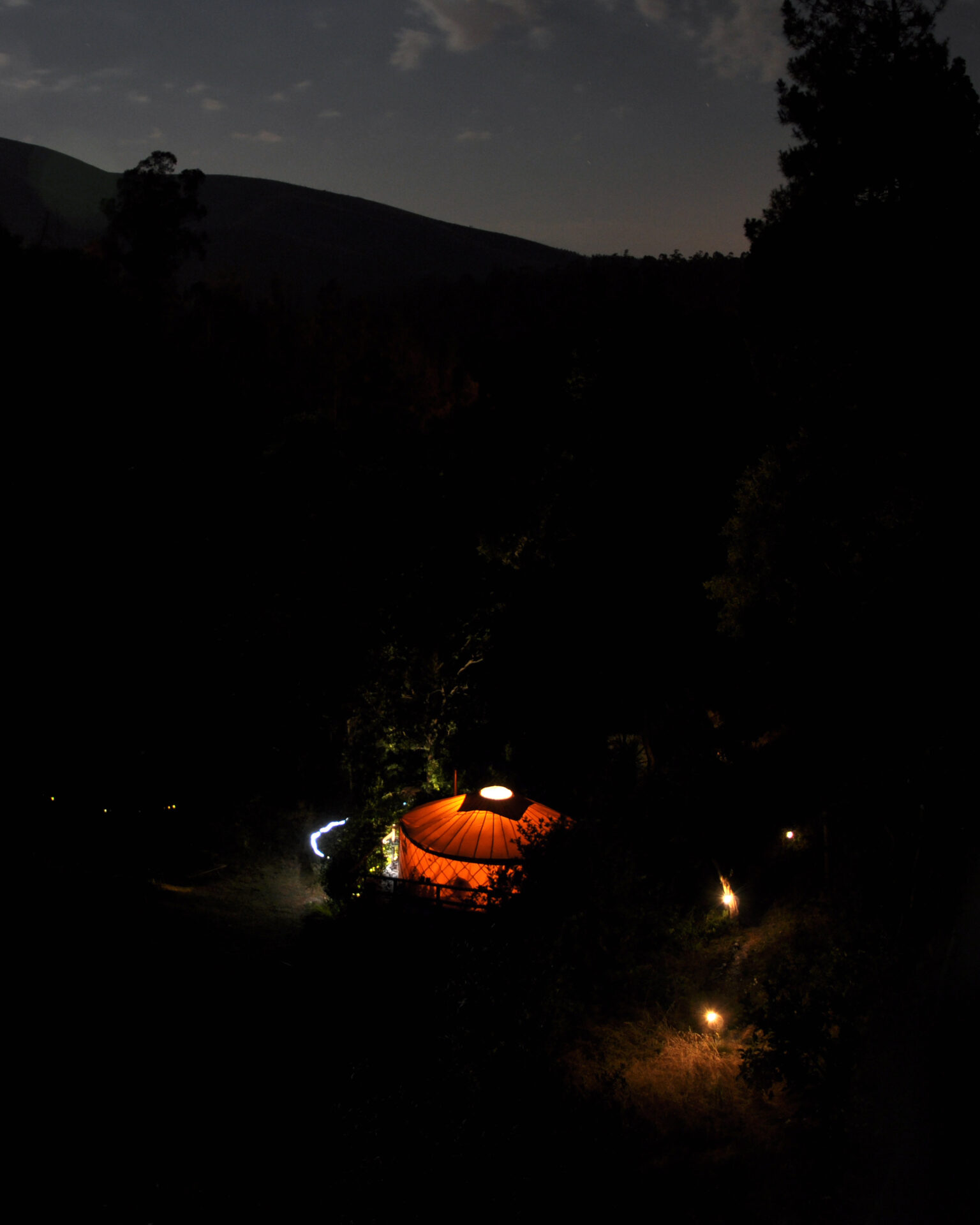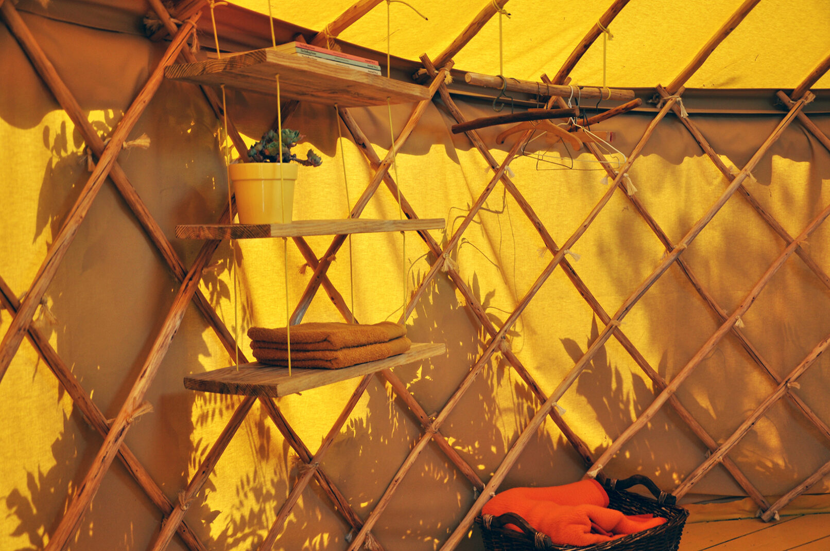 This Yurt was built as part of a small glamping business. It was made completely from scratch, the main wood structure is made from locally sourced eucalyptus saplings. The whole structure is completely collapsible and is stored during the winter. It features a steam bent crown (skylight and ventilation) and a collapsible custom door & doorframe. Most additional furniture and fixings were also hand-crafted.