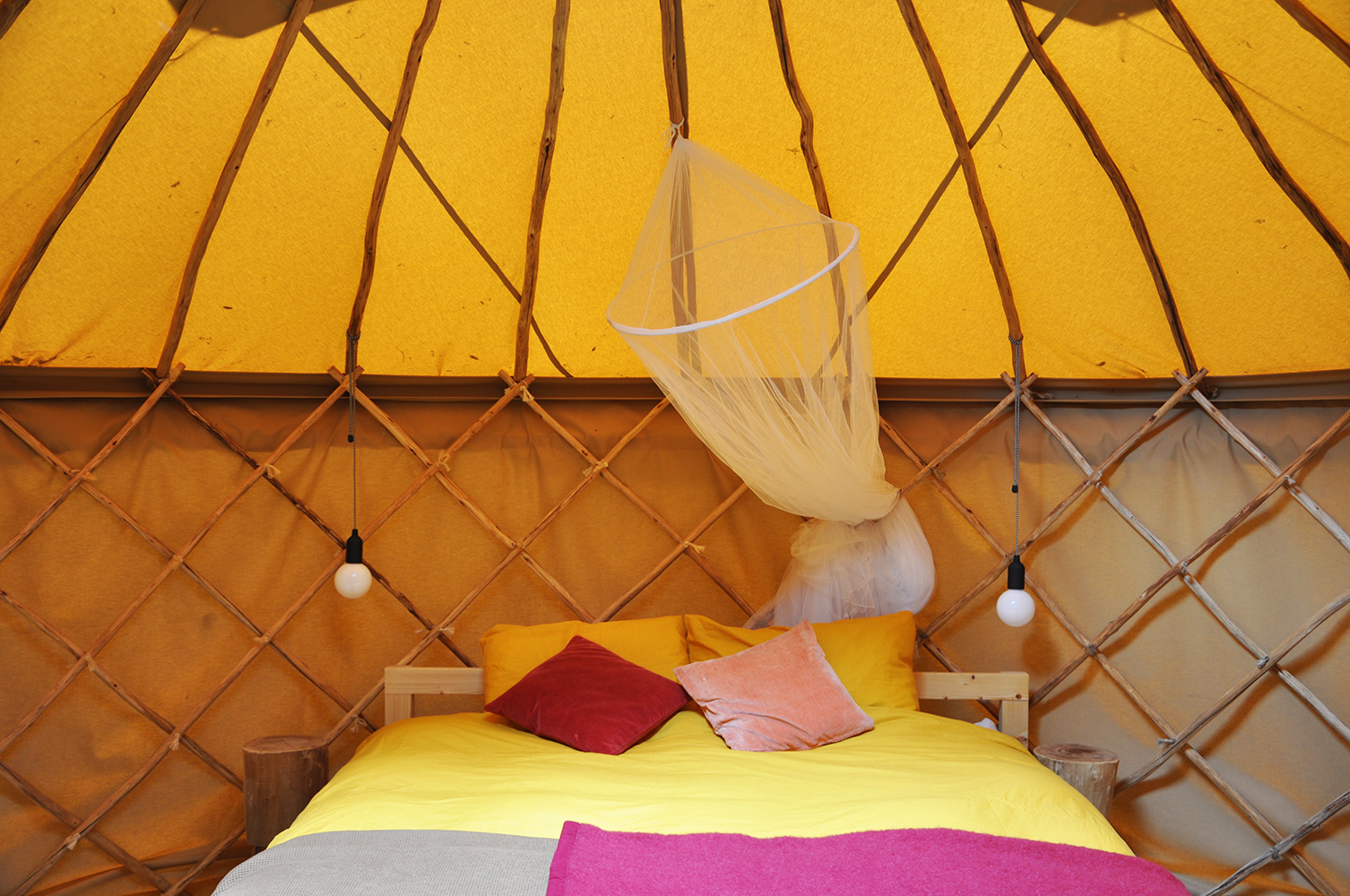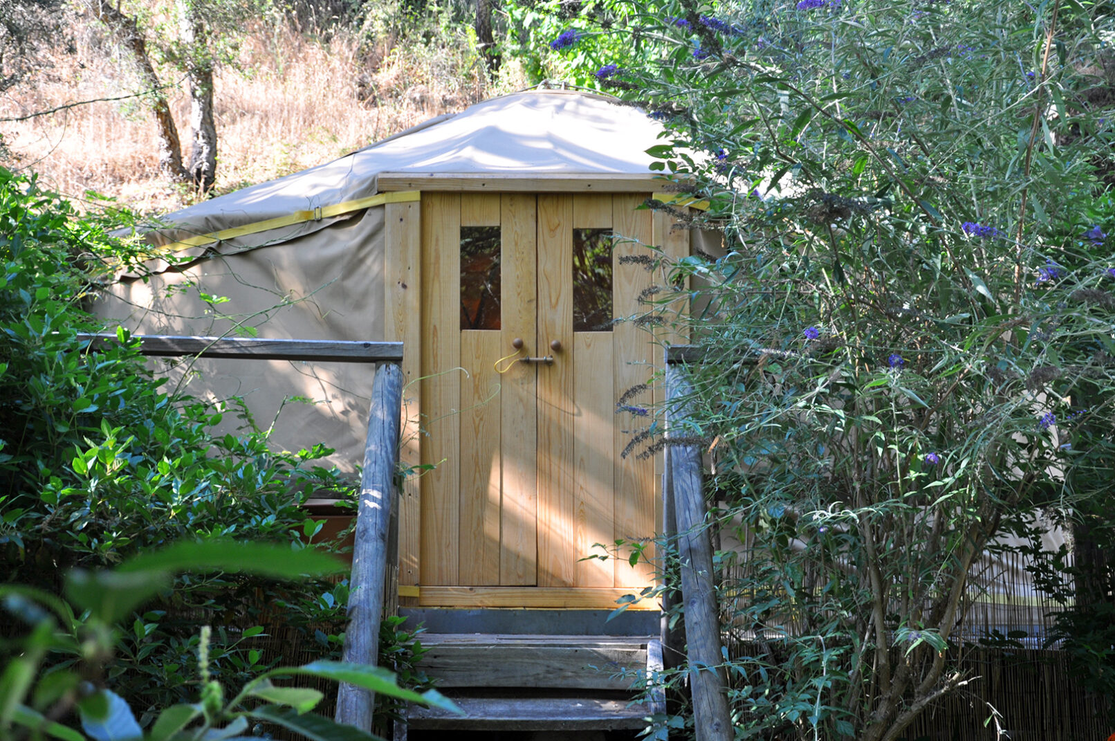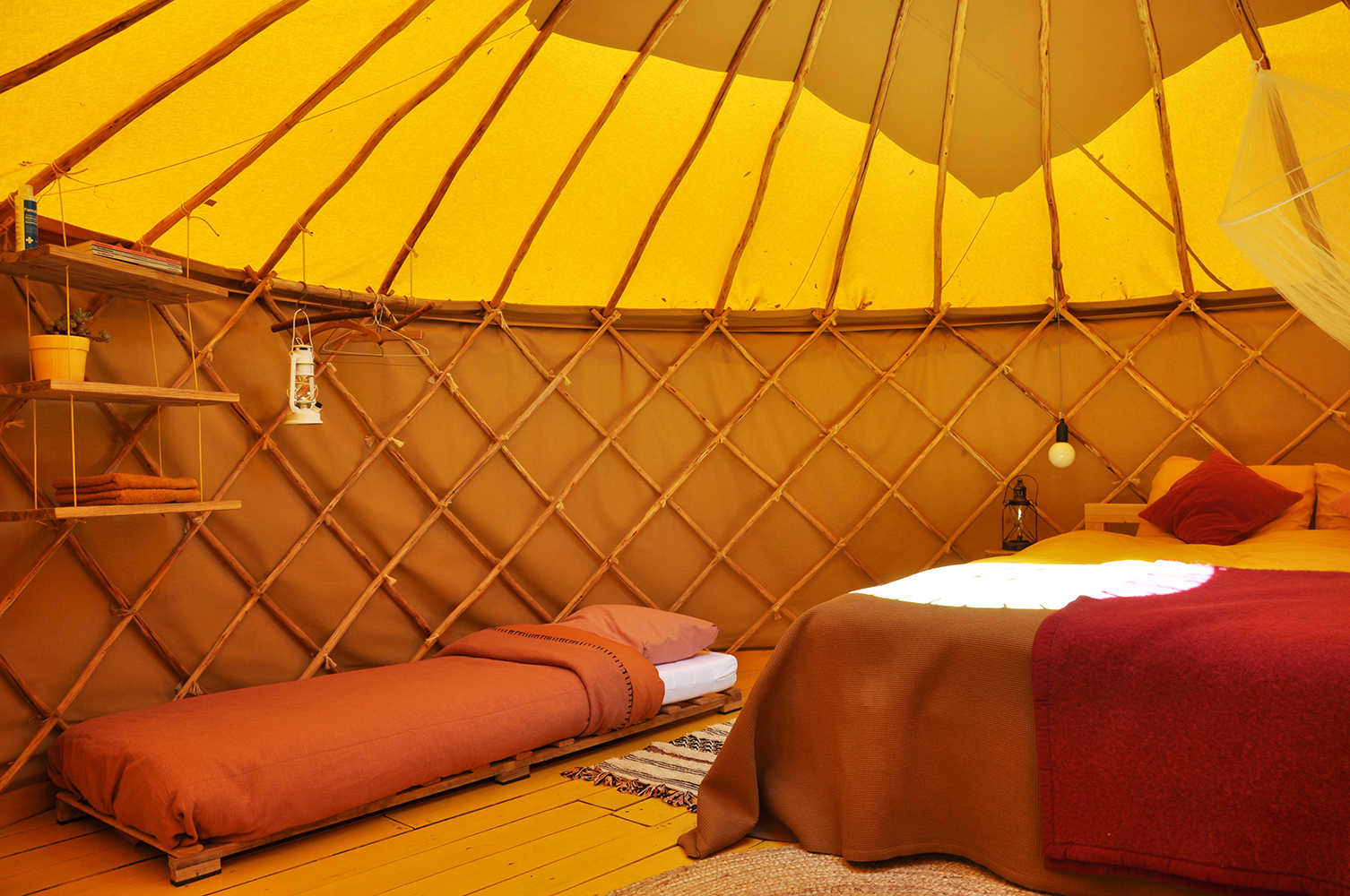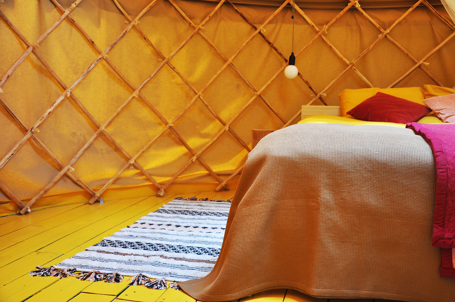 This Yurt was built as part of a small glamping business. It was made completely from scratch, the main wood structure is made from locally sourced eucalyptus saplings. The whole structure is completely collapsible and is stored during the winter. It features a steam bent crown (skylight and ventilation) and a collapsible custom door & doorframe. Most additional furniture and fixings were also hand-crafted.